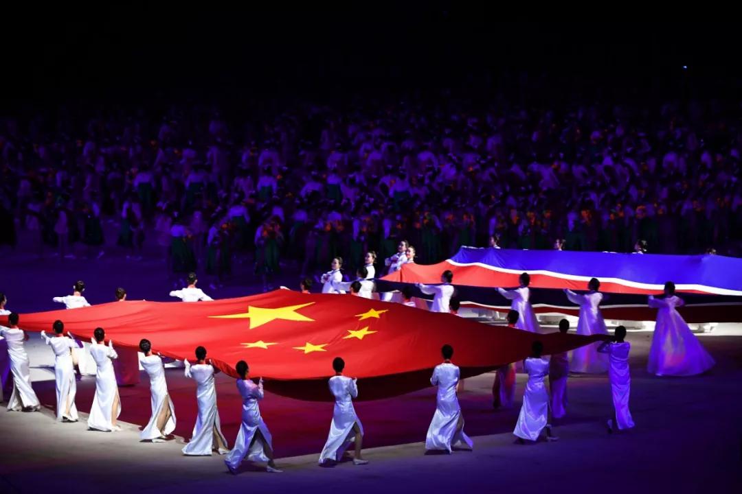 當地時間晚9時40分許,習近平和夫人彭麗媛在金正恩和夫人李雪主陪同下,來到體育場主席臺。在場觀眾全體起立,以熱烈的掌聲和歡呼聲,歡迎中國貴賓的到來。