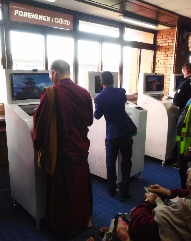 在“VISA APPLICATION”的指引牌的引導下,你就會發現很多臺下圖的申請落地簽的電子設備,正常的機器屏幕上會顯示“Welcome to the Department of Immigration,Nepal",根據屏幕指示點擊進入到下一個環節!