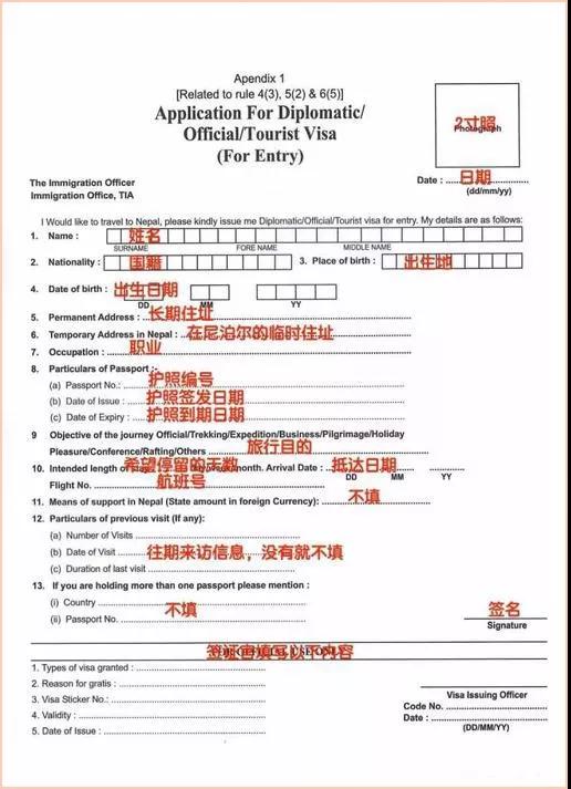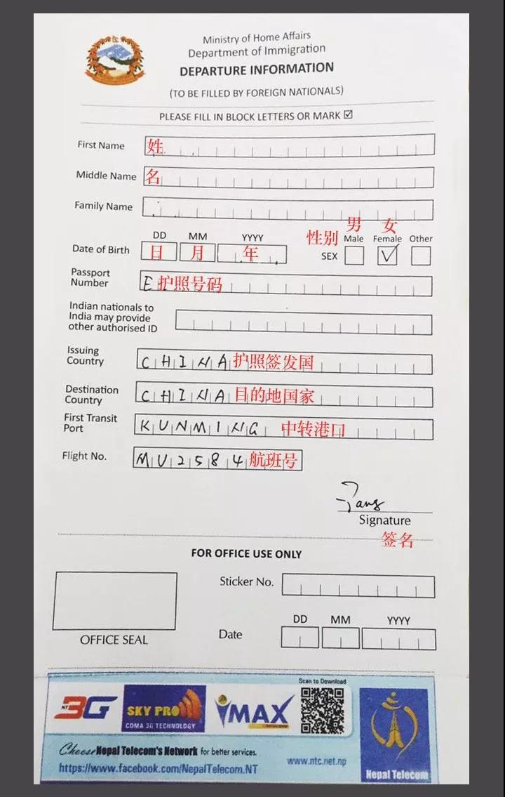 抵達加德滿都國際機場,進入航站大樓穿過走廊后,達到入境大廳。在桌子上,可以很容易找到入境卡。如果乘坐國內航空公司飛機入境,飛機快抵達時,空乘人員會給每位乘客分發一張入境卡,如果空乘沒有主動給,自己可以在飛機上向空乘人員索要入境卡。入境卡是每個人都務必填寫的,包括已辦理好簽證和準備辦理落地簽的游客。