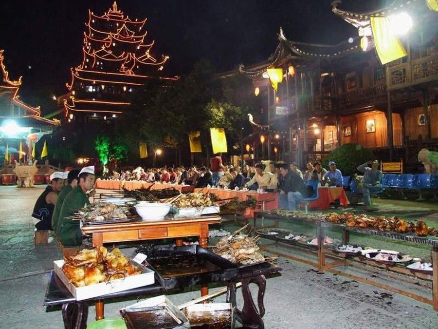 進入土司城,首先看到土司城迎賓儀式,土家漢子迎賓鼓,吹牛角、放沖,土家姑娘攔門歌,敬攔門酒,進入城內(nèi),在祭祀堂前舉行百人土家大祭祖活動,男女老少唱擺手歌、跳擺手舞,登世界最高的吊腳樓九重天,參觀土家族千百年來文化展示。到土家山寨,聽土家歌,賞土家族最有代表風俗哭嫁,三棒鼓,花燈等民俗表演。