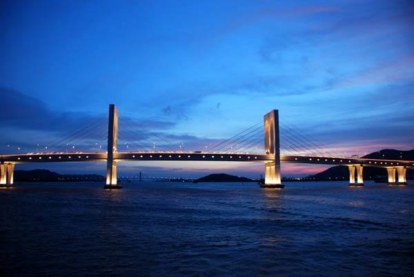 澳門“友誼大橋”,工程原稱新澳氹大橋,1994年初建成通車。位于舊大橋(嘉樂庇總督大橋)以東,連接澳門半島新口岸水塘北角(外港碼頭處)與氹仔北安碼頭。橋寬15米,設兩條雙線車道,中設分隔線,車道兩旁設1.5米寬的行人道。