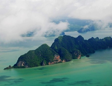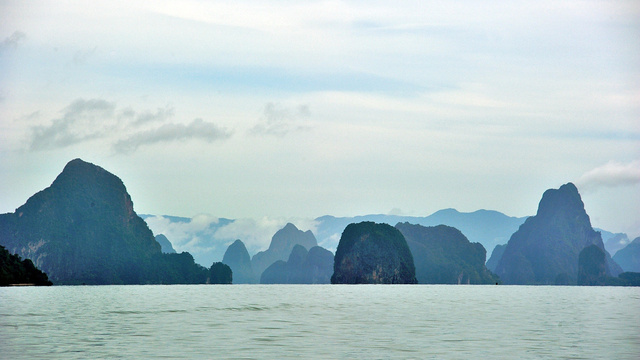 泰國南部的攀牙灣是一處風景優美的地方,波光粼粼。呈淡綠色的海灣水面上,石灰巖奇峰怪石星羅棋布,有的從水中聳起數百米。許多巖島看上去像駝峰,有些則像倒置栽種的蕪菁。