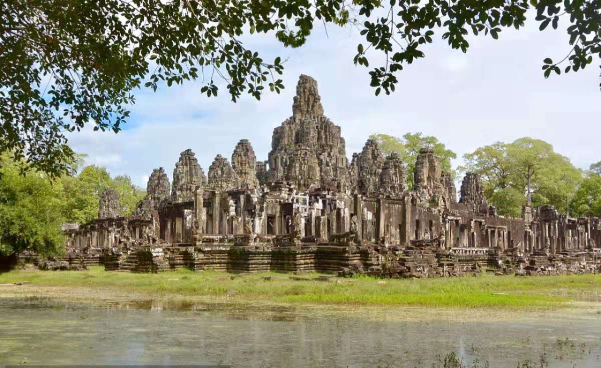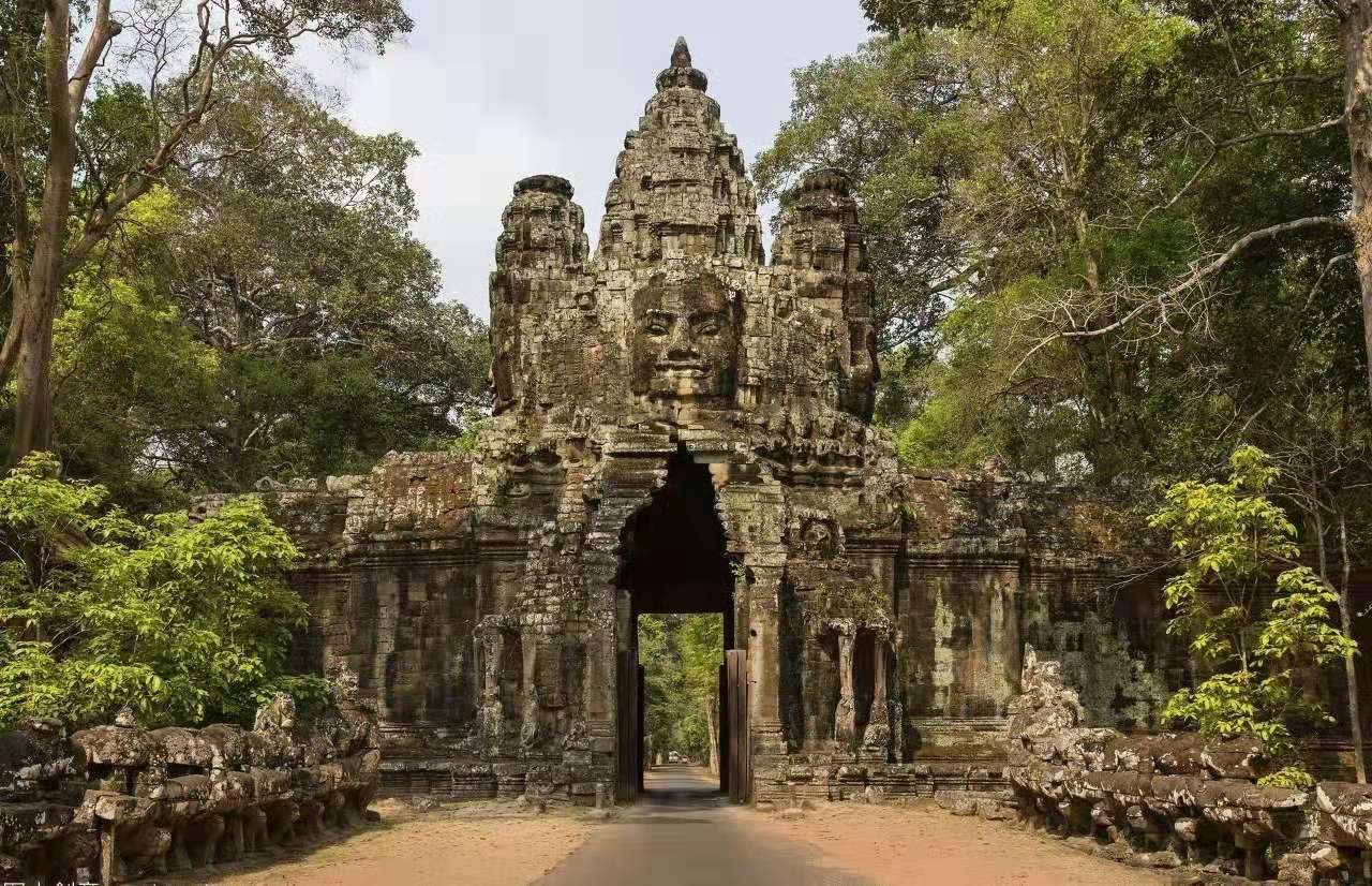 的闍耶跋摩七世驅逐占城人,1181年登基為王,在位三十余年間帝國達至頂盛。他在成為廢墟的首都大興土木,重建吳哥城(Angkor Thom)。鑒于先前被占城入侵的慘痛經驗,闍耶跋摩七世將吳哥城城墻筑得特別高又厚實1,城外建有護城河。城中心的巴戎寺(Bayon), 最著名的就是以闍耶跋摩七世面容為藍本來雕刻的54尊四面佛像,也是“微笑高棉”的由來,寺廟墻上浮雕不只展現闍耶跋摩七世與占城戰(zhàn)斗的壯闊場面,也有描 繪市井小民的生活場景。而因為闍耶跋摩七世篤信佛教,吳哥地區(qū)信仰開始由印度教轉變?yōu)榉鸾蹋诎腿炙轮幸部梢钥吹接《冉膛c佛教并存的特殊風格。除此之外, 闍耶跋摩七世還建造了大批寺廟如塔普倫寺(Ta Prohm)、達松將軍廟(Ta Som)等,也興建了不少醫(yī)院、旅舍。