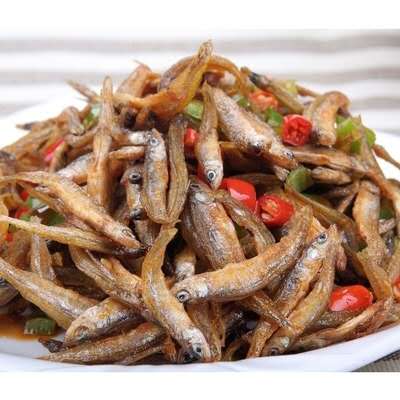 原料:小干魚(yú)100克、紅辣椒50克、油、鹽、姜、醬油適量