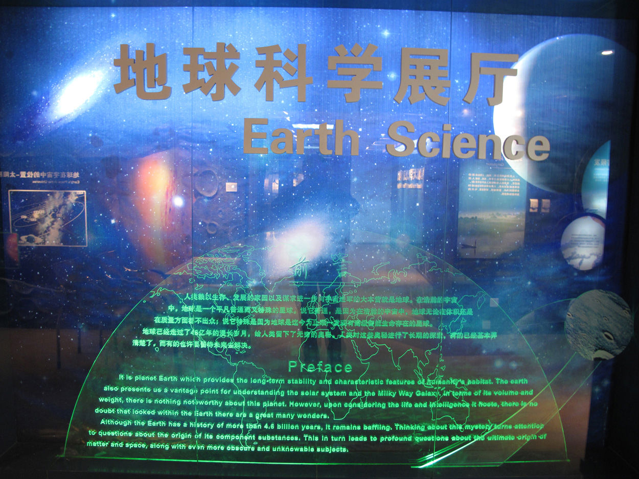 地學陳列展覽包括地球奧秘展廳、生命起源與進化展廳、珠寶玉石展廳、礦物巖石展廳以及礦產資源展廳。生動而豐富的展示內容配合新穎而獨特的展示形式為觀眾打開了地球46億年滄桑巨變的宏偉畫卷、地球生命38億年進化的歷史長廊,展示了精美絕倫的珠寶玉石世界、五光十色的礦物巖石天地以及與人類生存息息相關的地下寶藏,講述了人類與大自然和諧協調發展的重要性,告訴人們保護環境是每個人的神圣職責。其展示內容融科學性、知識性、通俗性和趣味性于一體,展示形式包括聲光電技術、模擬仿真技術、信息化展示技術、互動技術以及相關高新科技手段等。此外館內還設置了寶玉石禮品廳、寶玉石工藝品柜臺以及休閑服務區,可滿足游客休閑和購物的需要。