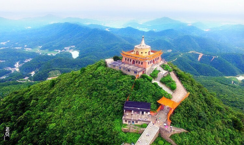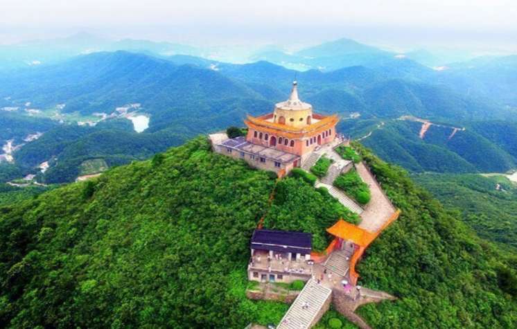 韶峰頂上唐時(shí)有韶峰庵,后來有仙頂靈廟,俱毀。1993 年在峰頂修復(fù)了古寺廟,由中國(guó)佛教協(xié)會(huì)會(huì)長(zhǎng)、著名書法家趙樸初題詞:韶峰古寺。寺殿門聯(lián)為:“舜帝南巡奏揚(yáng)韶樂傳天下;紅日東出播種福田在人間。寺分上下兩層,下層為一大廳,廳正中南向塑有舜帝金身,北向則為娥皇、女英。舜帝顯得雍容慈祥,二妃眼含凄切。舜帝左右靠墻處,有彩塑四大金剛,三面墻頂塑有二十四位諸天、十八位羅漢,神態(tài)、裝束各異,栩栩如生。上層又作觀日臺(tái)。韶峰寺——觀日臺(tái)(觀日閣)采用仿金字塔造型,底邊四角均為75°。這種結(jié)構(gòu)穩(wěn)定、堅(jiān)固、抗震、防強(qiáng)風(fēng),又能收到金字塔效應(yīng):人處塔中,身心格外舒暢,并產(chǎn)生一種奮發(fā)向上的力量。同時(shí),韶峰寺——觀日閣又融入了中國(guó)傳統(tǒng)文化中“天圓地方”的意蘊(yùn):其下部為正方形,上部為圓錐形,寺體由方而圓,愈上愈尖,至頂部綴有一顆錚亮的銀色金屬球,球上,一柄鋼針直插藍(lán)天。
