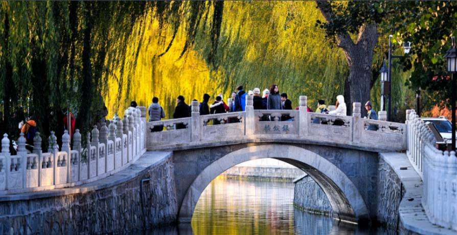 在橋身正面鐫刻著由故宮博物院副院長單士元老先生題寫的“銀錠橋”三個楷體大字。字體工整渾厚,滿著綠色,與周圍的碧水、高楊、翠柳相融。橋下水波粼粼,金光閃閃,橋畔楊柳夾岸,蔥蘢流翠;橋周圍古宅相擁,胡同密集,古韻悠然;隱于濃蔭中的王府、寺廟的屋頂飛檐依稀可見;橋的近處還有宋慶齡、郭沫若等多處名人故居,一派清雅幽靜的氛圍。別看銀錠橋橋體不大,卻是什剎海景區的點睛之筆。