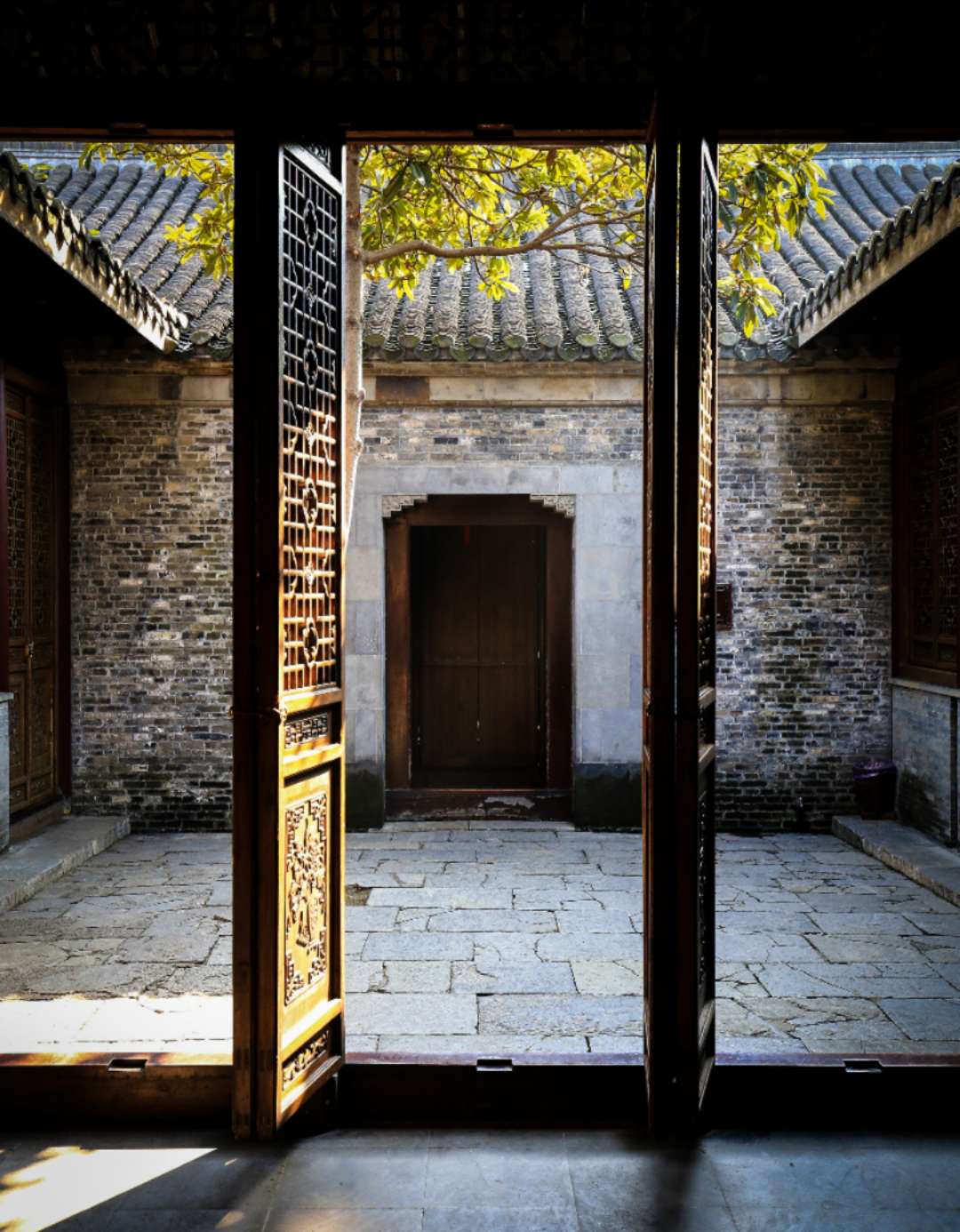 個園的四季園正中間為“宜雨軒”,東闊三楹,四面虛窗,可一覽園中全景。軒的屋頂用揚州常見的黛瓦,四角微微上揚,東西兩面墻上保留有幾塊建園時法國進口的花玻璃。宜雨軒是園主接待賓客的場所,軒前有對聯:朝宜調琴暮宜鼓瑟,舊雨適至今雨初來。