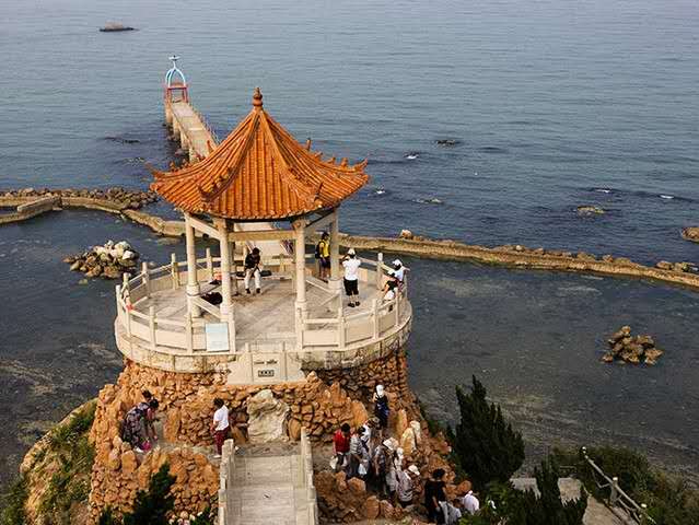 渤海雄渾之日落,南瞻“八仙相聚”的蓬萊閣,北眺遼東半島的老鐵山。仙境源東部開(kāi)口處臨海而立,頓感開(kāi)闊,該村人在此建一亭閣,高大約16米,順懸崖勢(shì)造陡峭臺(tái)階,左拐延伸出了一架棧橋,棧橋周?chē)鷦澇鰩滋庒烎~(yú)臺(tái)與海上游樂(lè)場(chǎng);右拐直達(dá)至海灘,四周懸崖峭壁圍成一處半圓灣,實(shí)屬一靜謐之所,灘上卵石約 3 米厚,光潔與柔潤(rùn)。身臨仙境源、心情舒暢、飄然欲仙!