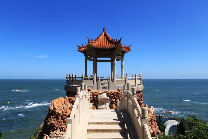 仙境源東面開(kāi)口處臨海而立,頓感開(kāi)闊,村人在此建一亭閣,高約16米,順懸崖之勢(shì)造陡峭臺(tái)階,左拐延