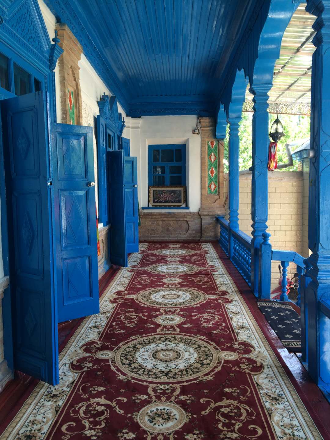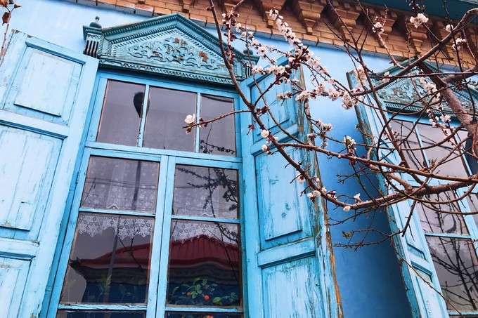 這里的民居與環(huán)境始終保持著較為完整的傳統(tǒng)風貌與格局,頗具中西亞特色及“塔蘭奇”傳統(tǒng)文化風格。喀贊其的房屋建筑對藍色的使用頻率非常高,或者在外墻,或者在屋頂,更多時候是在門板和窗欞,藍色大都是主色調(diào),整個建筑顯得精致而純凈。