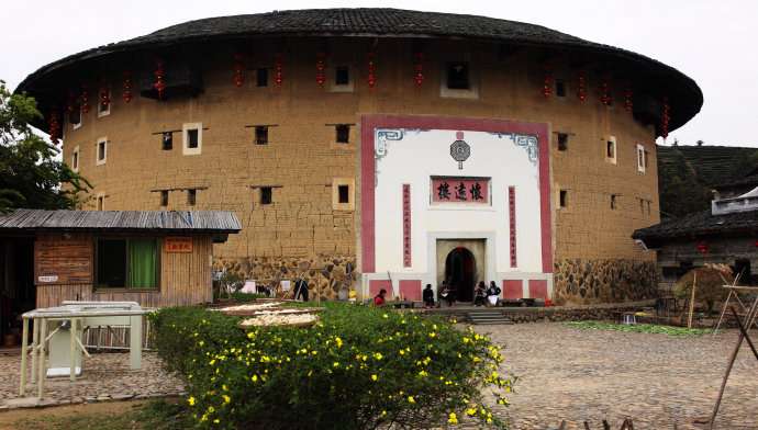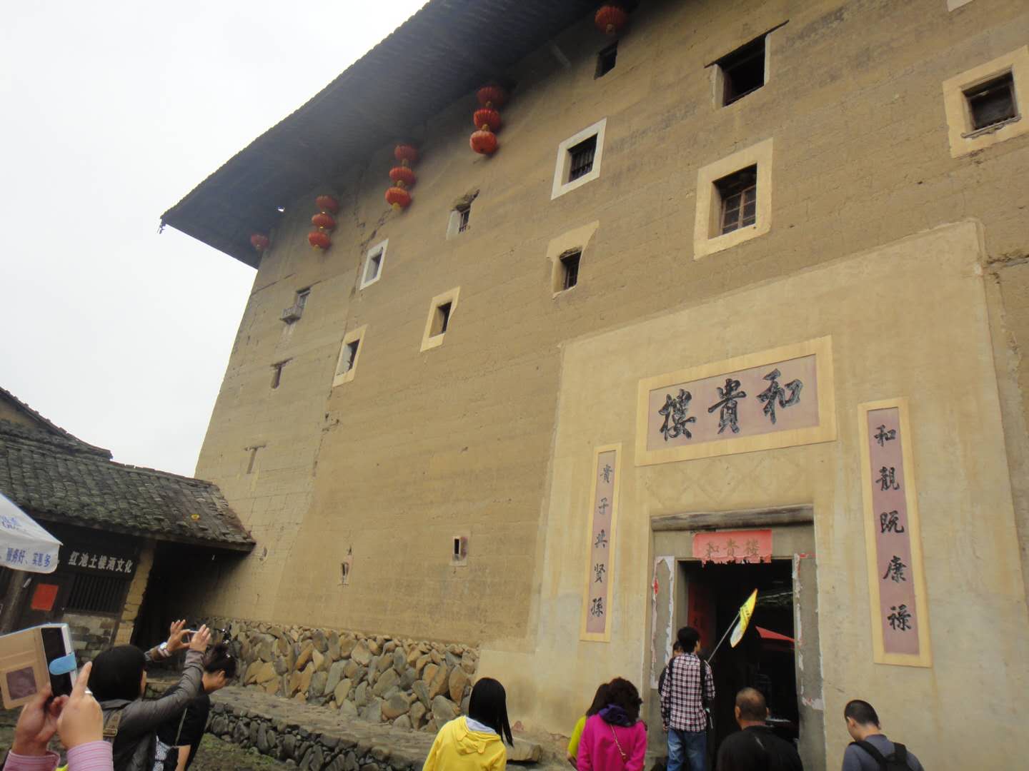 和貴樓每層有28個房間,共有140個房間。樓正中開一個大門,東西南北四方各有樓梯上下。它建于清雍正十年(1732年),據說當初選址建樓,開始并未發現這是塊沼澤地,樓建了一層,忽然整層樓像沉船一樣,慢慢下沉到了爛地里,建樓的簡姓族人無可奈何,只好在下沉的樓墻上打了100多立方米的排樁,他們覺得地基這下牢固了,就從頭開始夯墻,建起了一座五層高的方樓。他們似乎很有把握,從不擔心大樓會傾斜或者下沉,果然兩百多年來,和貴樓固若金湯,風雨不動安如山。現在,你在樓中學堂的小天井用鐵線往地