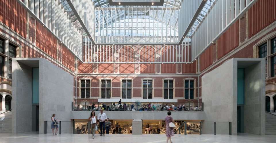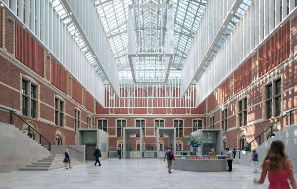 而我們今日所見的哥德教堂式的博物館大樓,乃建于1885年。博物館的面墻上全部飾以荷蘭歷史與藝術(shù)的圖像,面朝博物館廣場(chǎng)的南面,是彩色玻璃鑲嵌,描繪著阿姆斯特丹文化生活中重要人物的肖像。