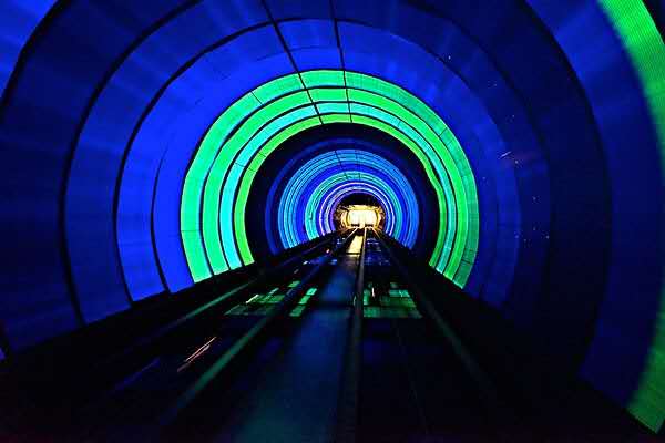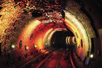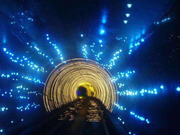上海外灘隧道。該隧道連接上海外灘和緊鄰東方明珠電視塔浦東。上海外灘觀光隧道穿越黃浦江。乘地鐵沿647米長的色彩變換不斷的隧道旅行,會讓游客感覺如夢如幻。