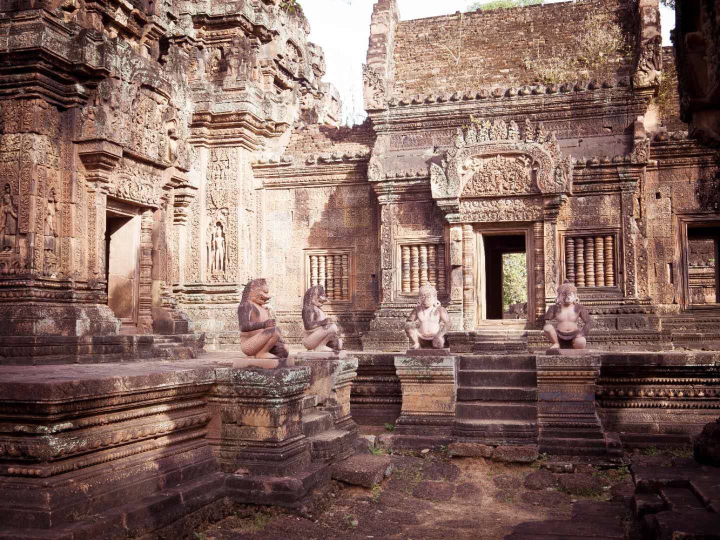 前護墻飾有7層精心制作的雕刻,包括無數(shù)的阿帕莎拉(apsara,舞女或者天仙)。更蔚為壯觀的是前護墻后隱蔽的壕溝里那些表情邪惡的形象。數(shù)世紀前因為最初的壇臺擴建,這些雕像被掩埋起來,所以看起來依然光鮮,就像昨天才雕刻出來的似的。