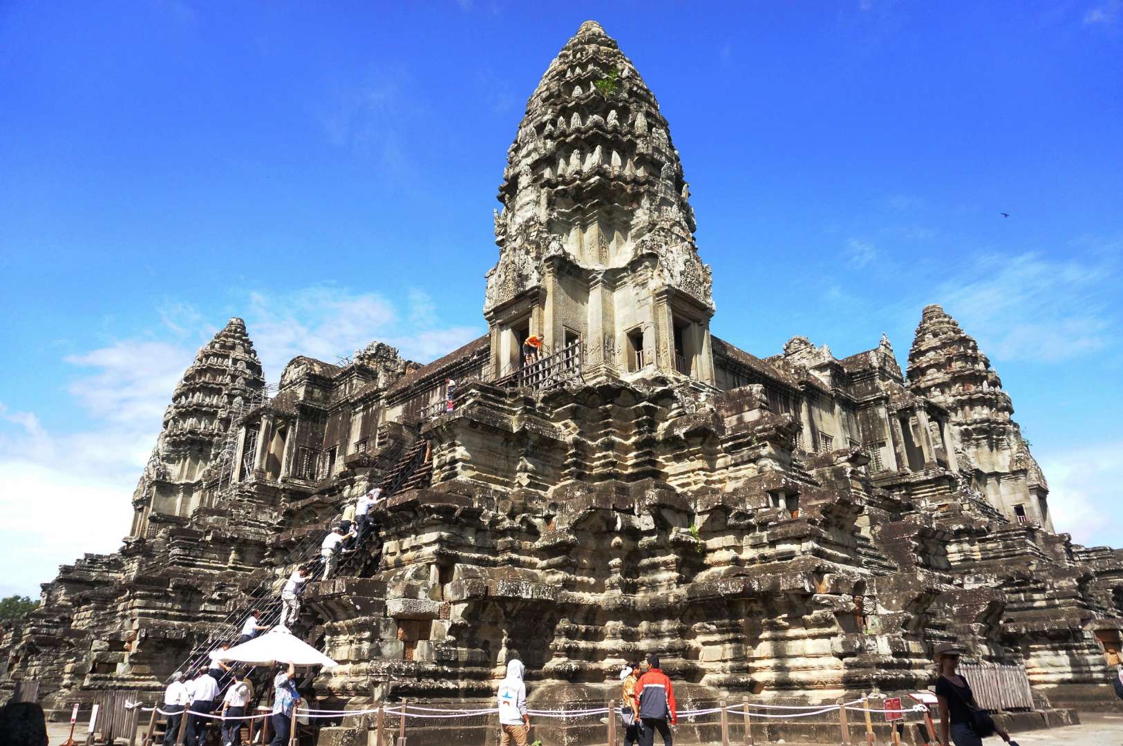 吳哥古跡現(xiàn)存600多處,分布在面積45平方公里的森林里。大吳哥和小吳哥是它的主要組成部分,其中有許多精美的佛塔以及眾多的石刻浮雕,蔚為壯觀。這些佛塔全部用巨大的石塊壘砌而成,有些石塊重達8噸以上。佛塔刻有各種形態(tài)的雕像,有的高達數(shù)米,生動逼真。吳哥寺中的五座蓮花蓓蕾似的佛塔高聳入云,是高棉民族引以為驕傲的精湛建筑。