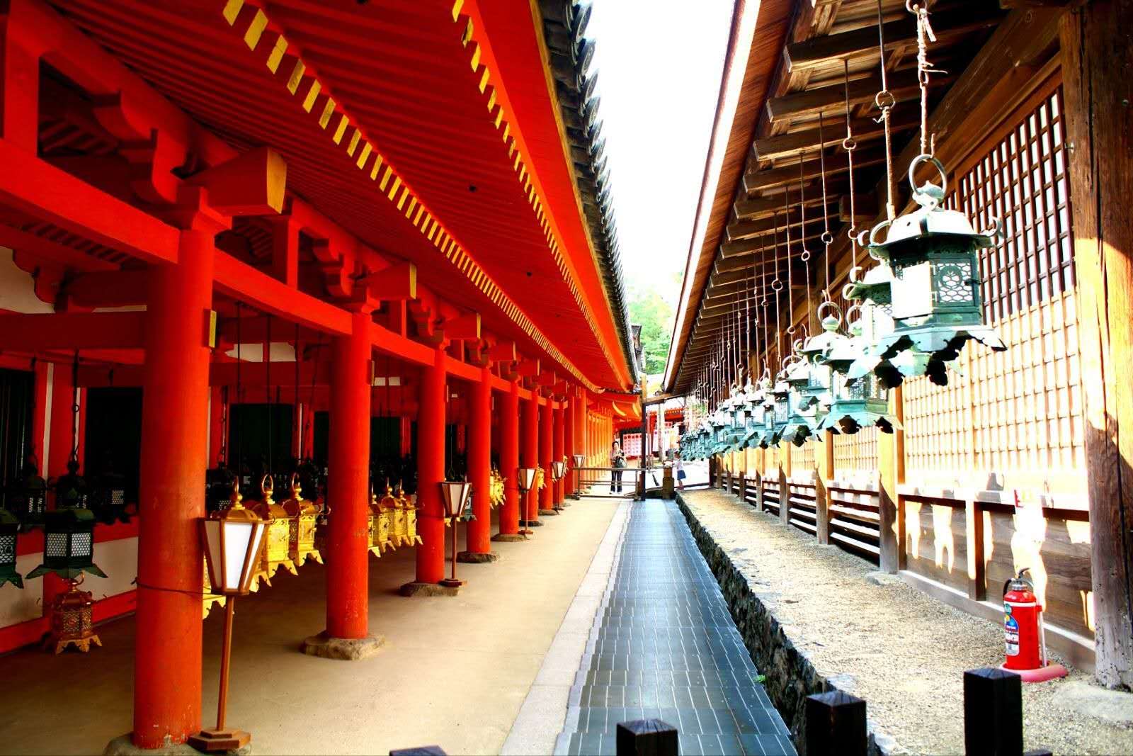 建筑特征為并立的4個社殿組成的本殿,圍繞本殿的朱紅色的回廊與春日山麓的綠色叢林相映成輝,與屋檐下垂下的燈籠和社殿一起構成了一幅情趣盎然的風景畫。版權所有山東聊城聊之旅國際旅行社有限公司,轉載必究!朱紅色的主殿自古就以藤樹著名,社內的3000座石燈籠和吊燈籠也也十分有名,在“春日大社神苑”里種植著約300個品種的植物,這些植物均在古代有名的歌集《萬葉集》中有記載。 另外,社內還藏有包括520件國寶級文物在內的3000件文物。