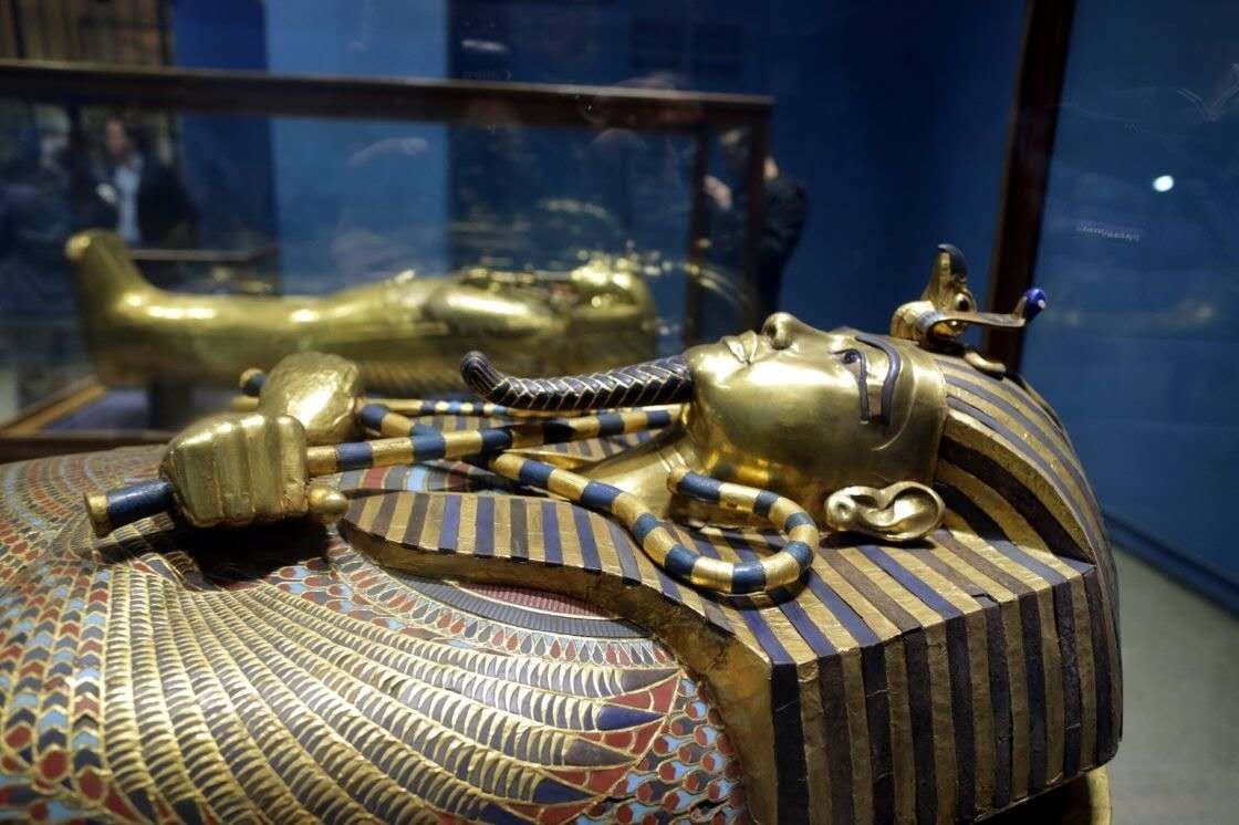 第18代法老王朝圖坦卡蒙陵墓中出土的1700余件文物,其中有金質御座、黃金面具、黃金棺、黃金飾物,圖坦卡蒙及王后的精美淺浮雕像,法老的輦車,兵車和狩獵用彎弓,鑲嵌象牙和彩色玻璃的家具,王后的珠寶首飾和衣箱等。