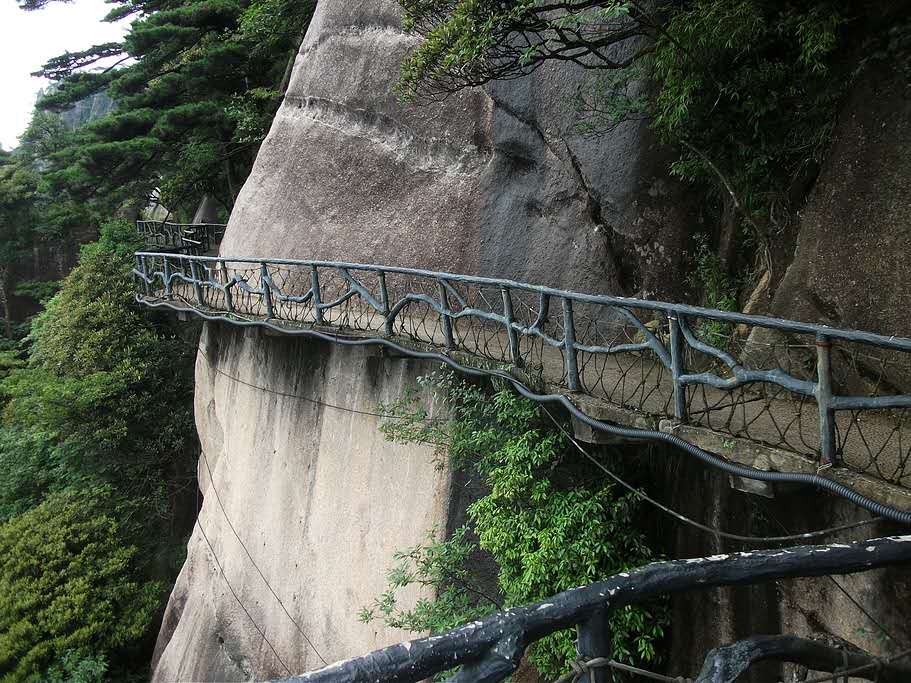 在海拔約1600米的高山懸崖絕壁上,橫空出世,向外懸挑出一條全長約3700米,寬1.3米至2米的鋼筋混凝土棧道。因其中有2700米不見臺階,宛若玉帶,平整如岸,故名西海岸。由三清山風景名勝區管委會于2002年6月建竣。