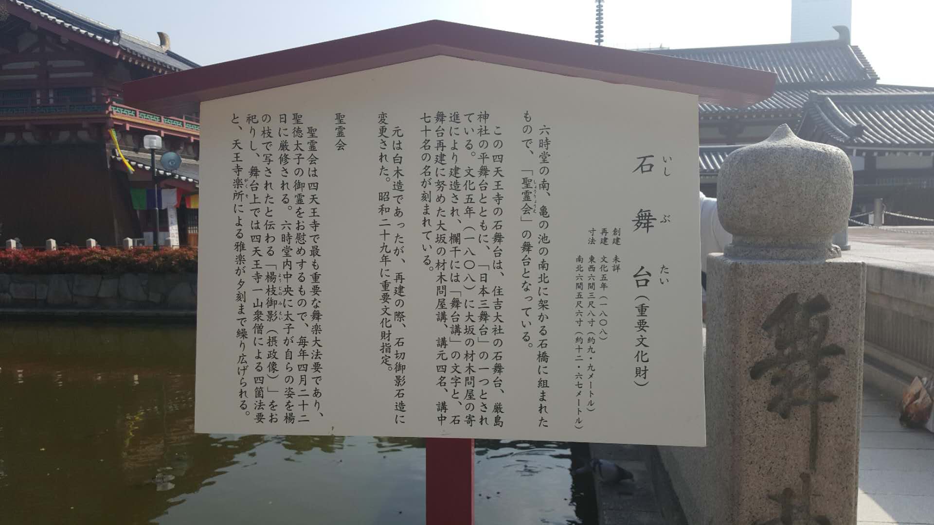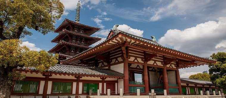 四天王寺是593年由圣德太子所建立的日本佛教最早的寺院,因此它也是日本最古老的官家寺院。它不僅僅作為佛界守護(hù)、鎮(zhèn)護(hù)國(guó)家的寺院而成為政治外交的中樞,而且還是美術(shù)工藝產(chǎn)業(yè)等日本文化的發(fā)源地。以后將中門(mén)、五重塔、金堂、講堂等呈一條直線(xiàn)排列、外部則由回廊環(huán)繞的建筑模式稱(chēng)為“四天王寺式”,其模式來(lái)源應(yīng)為中國(guó)和朝鮮半島。雖然殿堂、寶塔、寺院多次遭遇戰(zhàn)炎和天災(zāi)和毀壞,但每次都得以重建,所以至今仍保持著最初建造時(shí)的飛鳥(niǎo)時(shí)代的雄姿,充分體現(xiàn)了這座寺廟的悠久歷史和它在大阪人心中的地位。