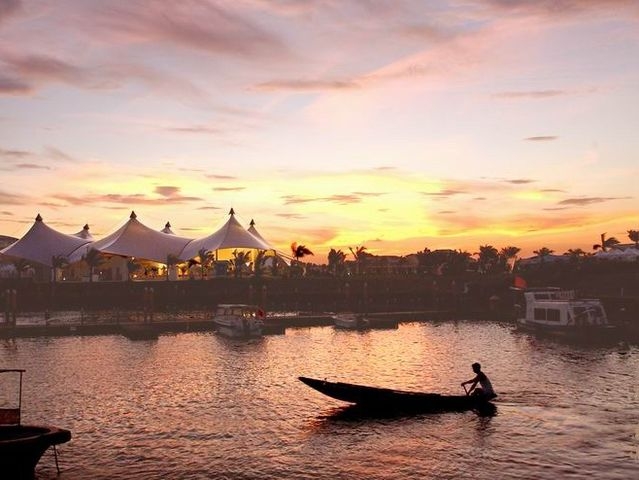 博鰲亞洲論壇會(huì)址建在三河出海口的西南岸邊,由五個(gè)巨大白色帳篷組成,遠(yuǎn)眺似天空飄浮的五朵白云;東面是三河出海口的腹部,前面寬闊的港灣和沙白如銀的玉沙帶;西面和南北面系博鰲水城,別墅星羅棋布。夜晚,萬盞彩燈競(jìng)亮,猶如天上人間。