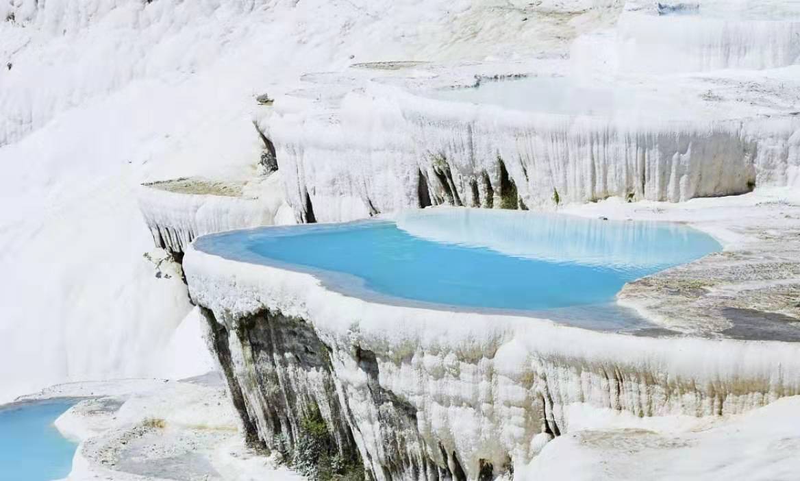有山有水的白色棉花堡,從2千年前的希臘時代起就是溫泉療養勝地,如今更是遠近馳名,成為土耳其最重要的觀光景點之一。泉水從山頂往下流,所經之處歷經千百年鈣化沉淀,形成層層相疊的半圓形白色天然階梯,遠看像大朵大朵棉花矗立在山丘上,所以土耳其人叫它為棉花堡。美麗的露天浴場,清澈的泉水中,還可看到2千多年的希臘石柱。當地水溫攝氏36度至38度之間,酸堿值6左右,泉水富含鈣、鎂等礦物質,可供飲用及沐浴,對于風濕、皮膚、婦科、消化不良、神經衰弱等皆有療效。