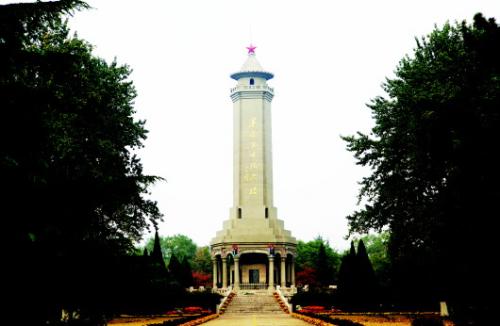 革命烈士紀念塔位于陵園中心位置,與南大門、紀念堂、北大門在同一中軸線上。1949年4月28日奠基,1950年5月1日落成,和北面的革命烈士紀念堂為陵園初建時的兩大主題建筑。塔高45米,塔的建筑形式為五角亭柱式(亦稱五角立體塔型),全部有花崗石、石灰石、鋼骨水泥構成,分為塔臺、塔身、塔頂三部分。塔頂綴以大型景泰藍質紅五星。塔身正面“革命烈士紀念塔”7個貼金大字為毛澤東主席親筆手書。