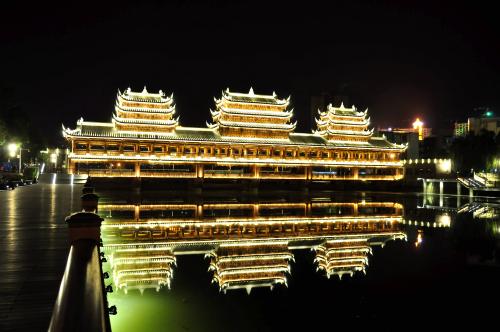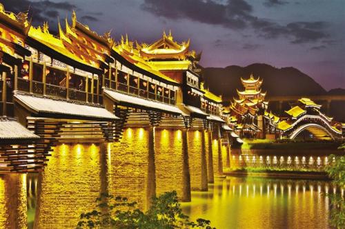 黔江濯水古鎮(zhèn)風(fēng)雨橋橫跨于阿蓬江上,長(zhǎng)303米、寬5米,據(jù)說(shuō)是亞洲最長(zhǎng)的廊橋,分為橋、塔、亭三部分。濯水古鎮(zhèn)風(fēng)雨橋橋身為純木制結(jié)構(gòu),建筑材料之間以榫頭卯眼互相穿插銜接,直套斜穿,結(jié)構(gòu)牢固精密。橋建有三層塔亭,兩側(cè)有約百扇可自由開合的雕花木窗,橋內(nèi)擺放有紅漆長(zhǎng)凳。