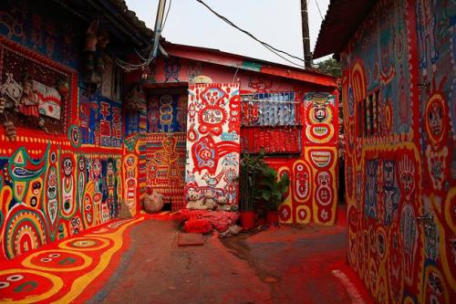 起源于住在臺(tái)中市南屯區(qū)嶺東科技大學(xué)附近有一處舊眷村的八十七歲老榮民黃永阜,因?yàn)椤笩o聊」而拿起畫筆彩將眷村內(nèi)的巷弄街道當(dāng)成了天然的畫布,在上頭彩繪了各式美麗的彩虹線條與可愛動(dòng)物,不僅染亮了小村,在網(wǎng)路上引起熱烈討論,更形成一股參訪風(fēng)潮。黃永阜先生86歲時(shí)開始作畫,他用自己手中的畫筆在眷村老舊的房屋和街道上勾勒出一個(gè)色彩斑斕的童話世界。老人最初只是在自家的屋里屋外用畫筆描繪心事,打發(fā)時(shí)光。后來不少鄰居被他充滿童真的畫所吸引,也邀請(qǐng)他去作畫,就這樣老人在無意中創(chuàng)造了一段色彩繽紛的傳奇。如今,他所居住的位于臺(tái)中市春安里的眷村被人們賦予了一個(gè)好聽的名字:“彩虹眷村”,并成為了當(dāng)?shù)氐臒衢T景點(diǎn),每年吸引約50萬人前來參觀,而香港籍退伍老兵黃永阜則被人們親切地稱為“彩虹爺爺”。走進(jìn)“彩虹眷村”,地面上、墻壁上畫滿了色彩艷麗、造型俏皮的兔子、小雞、猴子、小鳥、卡通人物、花朵、太陽以及彩虹等。紅色、黃色、藍(lán)色、綠色、白色,絢爛的色彩和極富想象力的線條,讓人們馬上置身于童話世界中。村口那條數(shù)十米長(zhǎng)的巷道是“彩虹爺爺”作畫最多的地方,也是最熱鬧的地方。這里的畫色調(diào)明艷、熱烈,地上用油漆涂成了紅底,上面用白色和黃色等勾勒出小鳥、小雞和兔子等造型;墻上則分區(qū)塊時(shí)而以藍(lán)色為背景、時(shí)而以白色或黃色為背景,上面畫了數(shù)百卡通造型的猴子、貓和孩童。