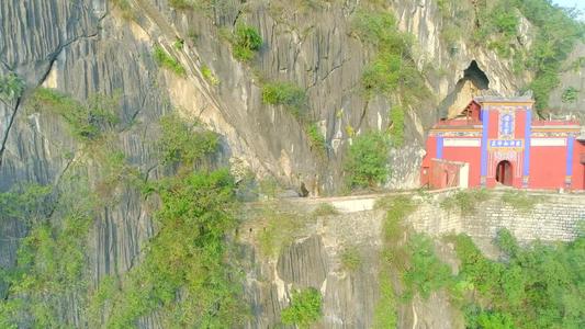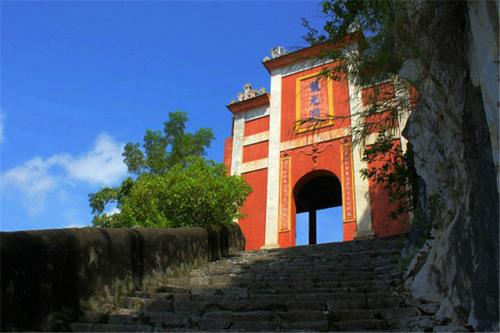 來到將山東麓,當年的營盤已蕩然無存,但刻著“小壘城”的石條拱門尚在。豎于其旁的《將山鎮龍炮臺記》碑,字跡勁挺,依稀可辨。朝山望去,千級石階,高處接云端。懸崖削壁,怪石崢嶸。古藤纏繞,老樹伸枝。拾級而上,見道旁石壁刻詩云,“尋山幸有今生福,拾級真同蜀道難。”過了惜字塔,折右拐彎,一座朱色牌坊驀然顯現,門額鐫字,“龍元洞”。才入洞口,一道五彩門樓橫在面前,豎題門額曰:“保元宮”。額下有對子,聯右,“江城如畫,俯視交州,巖岫有靈嚴鎖鑰”,聯左,“樓閣環方,上通帝闕,神仙應喜此蓬萊”。