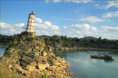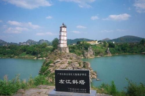歸龍斜塔:又稱左江斜塔和水寶塔,位于廣西崇左市郊東北二公里處,建在左江中的石頭島——熬頭峰上,處于急灣激流之中,地勢(shì)驚險(xiǎn)。