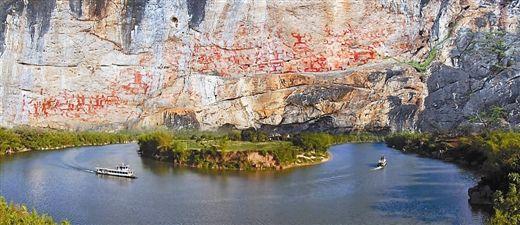 廣西左江流域的寧明、龍州、崇左、扶綏、大新、天等、憑祥等縣市的沿江地區(qū)都分布有崖壁畫,共79處,這些崖壁畫多集中在江河轉(zhuǎn)彎處寬大、平整、垂直壁上,陸地石壁和洞穴也有少量分布,花山崖壁畫是其中規(guī)模最大的,全幅畫長135米,高44米,分布在寧明縣明江耀達河段的花山崖壁上,畫有朱紅色人物1300多個;最大的高達3米,最小的僅0.3米,間有少量獸類和器具,規(guī)模宏大,內(nèi)容十分豐富。所畫人物有雙腳“八字”蹲、兩手上舉和雙腳下彎、兩臂前撐等姿態(tài)。每組畫中,常見一高大的人位于人群中央,腰佩刀劍,旁邊有銅鼓、狗和馬等形象,似是作戰(zhàn)會師、慶祝大會或集體娛樂等場面。據(jù)專家考證,這些崖壁畫繪制于戰(zhàn)國早期至東漢之間,是壯族先民通過圖騰崇拜以祈求五谷豐登、人丁興旺,其線條粗擴,造型古樸,歷經(jīng)數(shù)千年風雨侵蝕,依然清晰可見,不僅在廣西,在世界上也極為罕見。