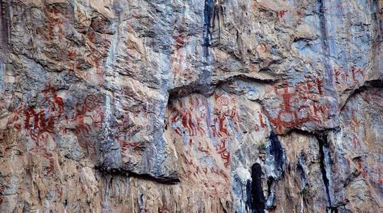 這些圖像在崖壁上錯綜呈現(xiàn),組成一幅幅完整的圖畫——典型的組合是一個高大魁偉、身佩刀劍的正身人像居中,腳下有狗,身旁有銅鼓,四周有眾多動作一致的側(cè)身人像。整個場面布局規(guī)整,疏密相間,動感十足,極像一場莊嚴又歡快的祭祀活動。這些色彩鮮艷、不斷重復(fù)的畫面,與山崖、河流和臺地共同構(gòu)成了神秘而震撼的文化景觀,被稱為“崖壁畫的自然展覽宮”、“斷崖上的敦煌”。