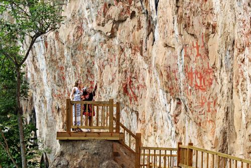 “初識壁畫認前朝,色自丹丹跡未凋。”千年的時光,也打磨不去花山巖畫的色彩,這不能不說是一個奇跡。關(guān)于繪畫的顏料,目前已有定論。據(jù)介紹,歷年來國家文物保護部門的有關(guān)專家,先后用科技手段對花山巖畫的作畫顏料進行過檢測,發(fā)現(xiàn)其中的主要成分是一種天然礦物質(zhì)原料——赤鐵礦。版權(quán)所有山東聊城聊之旅國際旅行社有限公司,轉(zhuǎn)載必究!然而只有這天然赤礦粉,無法在堅硬、光滑而且直立的崖壁上作畫,必須配以粘劑調(diào)合。經(jīng)過進一步檢驗,發(fā)現(xiàn)顏料里的確包含有膠著劑成分,但是檢測出來的膠類,到底是植物膠還是動物膠?以當時較為原始提煉工藝,古駱越人又是如何獲取這些成分的?膠與赤鐵礦又是如何配制的?這又給人們留下了許多謎團。