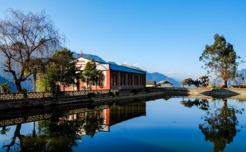 老姆登教堂,青磚墻,紅漆木窗,白鐵皮屋頂,簡(jiǎn)單樸素。從外表看,這座教堂并不壯觀,沒有常見的玻璃彩窗、穹頂、和標(biāo)志性的哥特式尖塔,有的只是長(zhǎng)條凳和紅漆木窗,但這更顯出人們信仰的純粹和虔誠。每個(gè)星期天(周三、周六晚上八點(diǎn)亦有),周邊鄉(xiāng)村的基督教信徒都會(huì)集中在這里做禮拜,他們聚集在這里虔誠的念誦贊美詩,對(duì)于那些和著太陽和泥土味道的樸實(shí)的人民,上帝就住在他們心里,他們像呼吸一樣自然安詳虔誠的哼出那些歌謠。村民唱圣歌是用傈僳語唱的,傈僳族的文字始自圣經(jīng)的翻譯,也為怒族所共用。