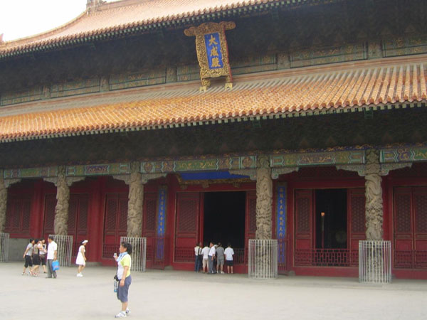洙水橋北,先是一座綠瓦三楹的高臺(tái)大門——擋墓門,后面就到了供奉孔子木主的享殿。去享殿的甬道旁,有四對(duì)石雕,名曰華表、文豹、角端、翁仲。華表系墓前的石柱,又稱望柱;文豹,形象似豹,腋下噴火,溫順善良,用以守墓;角端,也是一種想象的怪獸,傳說日行1萬8千里,通四方語言,明外方幽遠(yuǎn)之事;翁仲,石人像,傳為秦代驍將,威震邊塞,后為對(duì)稱,雕文、武兩像,均稱翁仲,用以守墓。兩對(duì)石獸為宋宣和年間所刻,翁仲是清雍正年間刻制的,文者執(zhí)笏,武者按劍。甬道正面是享殿,殿廣5間,黃瓦 歇山頂,前后廊式木架,檐下用重昂五踩斗栱。殿內(nèi)現(xiàn)存清帝弘歷手書“謁孔林酹酒碑”,中有“教澤垂千古,泰山終未頹”等詩句。解放戰(zhàn)爭時(shí),朱德總司令曾在此殿內(nèi)召開過軍事會(huì)議。