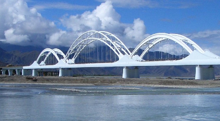 拉薩河特大橋是青藏鐵路的標志性工程,全長928.85米,最大跨度為108米 ,主橋采用五跨連續橋梁和中間三跨連續鋼拱組合體系,主跨采用雙層彎拱結構,這兩項均為國內首次使用,在同類橋梁中處于世界領先、亞洲第一的地位。該橋的主橋橋墩設計為牦牛腿式變截面雙圓柱墩,引橋橋墩設計為雪蓮花式變截面圓端形墩。大橋設計結構新穎,融民族特色與現代風格于一體,建成后大橋通體白色,連續的拱形猶如一條飛揚的哈達與金色的布達拉宮遙遙相望。