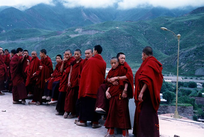 布久喇嘛林寺依山傍水,佛殿庭院掩映綠蔭之中,院內(nèi)藏犬成群。整個寺院形狀內(nèi)呈正四角,外底層屋檐共有二十角,第二到第三層屋檐為八角,佛殿高20余米,內(nèi)徑10余米,上覆金頂,呈塔形,四面墻體分以白蘭紅綠四色涂之,非常漂亮。喇嘛林寺有著名的蓮花生大師踐石遺跡,寺內(nèi)精美的壁畫也堪稱藏東一絕。