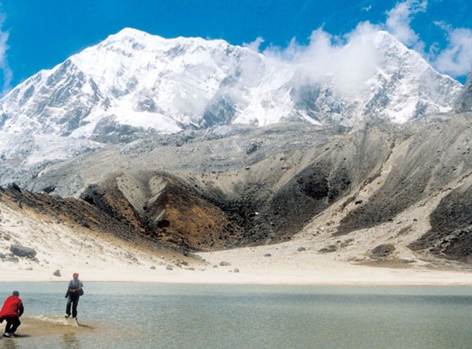 海拔8463米,地處喜瑪拉雅山脈中段,珠峰的東南方,是世界第五高峰。峰體上部覆蓋著厚厚的冰雪,坡谷中發(fā)育有巨大的冰川,冰川上多鋸齒型的陡崖和裂縫,冰崩十分頻繁。山腳地勢開闊,水源充足,森林茂密,春天各色杜鵑競相天放、絢麗奪目。