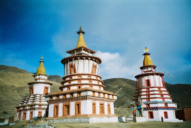 覺囊寺坐落在日喀則拉孜縣歐布瓊山山腰處,海拔4600米。始建于公元十二世紀,由貢巴•土杰尊珠主持修建。該寺曾有二萬多名僧人,在歐布瓊山上有二千多處修行洞和坐禪房,并修建了一座“萬佛一見得解塔”,塔高約27米,塔型呈“時輪壇城”,有108個門、108個殿堂。主供佛為喜繞堅贊師徒三尊佛。每年藏歷4月15日,該寺舉行“時轉跳神”活動。