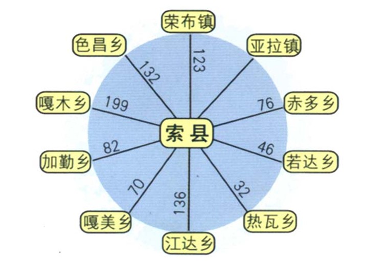 2001年,索縣轄:亞拉鎮、赤多鄉、嘎美鄉、嘎爾木鄉、加勤鄉、江達鄉、榮布鄉、若達鄉、 熱瓦鄉、色昌鄉、永納鄉、亞安鄉。
