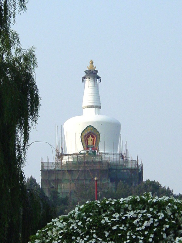 北海白塔—藏傳喇嘛塔 于清初順治八年(1651年),是一座藏式喇嘛塔。據(jù)建塔石碑記載,當(dāng)時(shí)"有西域喇嘛者,欲以佛教陰贊皇猷,請(qǐng)立塔寺,壽國(guó)佑民",得到皇帝的恩準(zhǔn),于是修建了永安寺和白塔。塔高35.9米,上圓下方,富有變化,為須彌山座式,塔頂設(shè)有寶蓋、寶頂,并裝飾有日、月及火焰花紋,以表示"佛法"象日、月那樣光芒四射,永照大地。塔身正面有一盾形小龕,內(nèi)塑紅底黃字的藏文圖案,含"吉祥如意"之意。此龕俗稱"眼光門",又叫"時(shí)輪金剛門"。1679年該塔被地震所毀,次年重建。1976年唐山地震波及北京,塔頂被損。在修復(fù)時(shí),發(fā)現(xiàn)塔內(nèi)主心木中藏有一個(gè)二寸見方的金漆盒子,盒蓋繪有太極圖,盒內(nèi)藏有兩"舍利",證明此塔是一座舍利塔。該塔矗立于瓊島頂峰,綠蔭擁簇,巍峨壯美,引人矚目。這種象征神權(quán)的建筑物--白塔和永安寺,設(shè)置于瓊島的重要位置上,具有主宰全園的氣勢(shì),以體現(xiàn)"君權(quán)神授"的封建思想,此是帝王宮苑的一大特色。