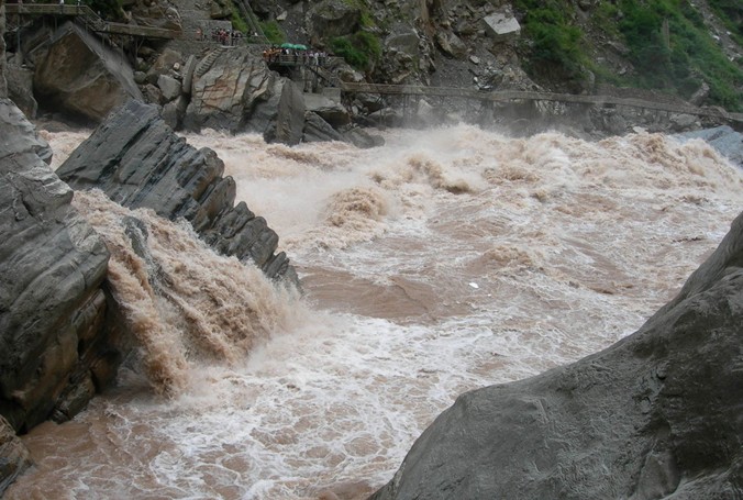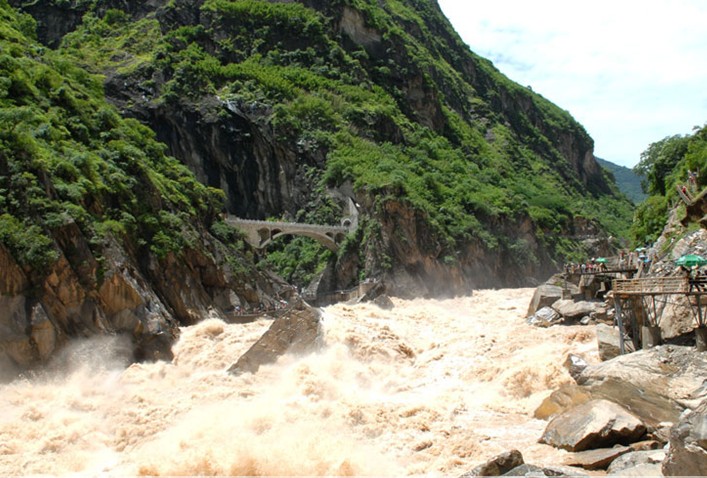 石鼓以下,江面漸窄,至左岸支流碩多崗河口橋頭鎮(zhèn),往東北不遠(yuǎn)即進(jìn)入舉世罕見(jiàn)的虎跳峽。虎跳峽上峽口與下峽口相距僅16公里,落差竟達(dá)220米。平均坡降達(dá)13.8‰,是金沙江落差最集中的河段。峽中水面寬處60米,窄處僅30米并有巨石兀立江中,相傳曾有猛虎在此躍江而過(guò),故名虎跳石,虎跳峽也由此得名。峽內(nèi)急流飛瀉、驚濤轟鳴,最大流速達(dá)10米/秒。峽谷右岸為海拔5596米的玉龍雪山,左岸為海拔5396米的哈巴雪山,兩山終年積雪不化。峽內(nèi)江面不足海拔1800米,峰谷間高差達(dá)3000余米。峽中谷坡陡峭,懸崖壁立,呈幼年期“V”型峽谷地貌。