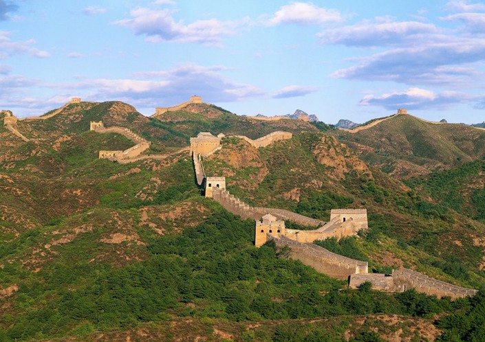 約公元前220年,一統天下的秦始皇,將修建于早些時候的一些斷續的防御工事連接成一個完整的防御系統,用以抵抗來自北方的侵略。在明代(公元1368~1644年),又繼續加以修筑,使長城成為世界上最長的軍事設施。在文化藝術上的價值,足以與其在歷史和戰略上的重要性相媲美。