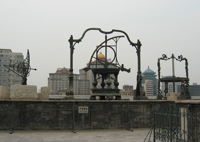 在明代,觀星臺(tái)上使用著明制渾儀、簡(jiǎn)儀、天體儀等大型儀器。清代康熙八年(1669年),比利時(shí)耶穌會(huì)傳教士南懷仁奉康熙帝之命,在前人的基礎(chǔ)上設(shè)計(jì)了六件新天文儀,至康熙十二年制成,計(jì)有:赤道經(jīng)緯儀、黃道經(jīng)緯儀、天體儀、地平經(jīng)儀、地平緯儀,紀(jì)限儀。新儀制成后,就將明代儀器全部移放臺(tái)下,將新制六件儀器安于臺(tái)上,進(jìn)行觀測(cè)。康熙五十四年(1715年),法國(guó)耶穌會(huì)傳教士紀(jì)理安設(shè)計(jì)的地平經(jīng)緯儀造成后安于臺(tái)上,這架儀器是地平經(jīng)儀、地平緯儀的合成,使用起來(lái)比較方便。但紀(jì)理安在監(jiān)制這架儀器時(shí),竟將臺(tái)下遺存的元明古儀充作廢銅使用,幸后來(lái)有人發(fā)現(xiàn)并奏明朝廷下令禁止,才保留了明制渾儀、簡(jiǎn)儀、天體儀三件(可惜,辛亥革命后,天體儀已不知去向)。這可以說(shuō)是北京古觀象臺(tái)上古代儀器的一大厄運(yùn)。