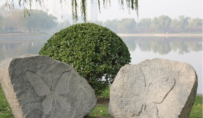 標(biāo)題:《蝴蝶夢(mèng)》材質(zhì):花崗巖。高度:1米。作者:錢瑞澤。 創(chuàng)意:這個(gè)作品主要表達(dá)一種環(huán)保意識(shí),假借史前化石的虛擬形象對(duì)滅絕的史前昆蟲之回憶,來呼喚人們對(duì)自然 的愛護(hù)。同時(shí),也嘗試地表現(xiàn)化石的質(zhì)感美,擴(kuò)大視覺美感的范圍,以試圖豐富雕塑的美感因素。安放在植物觀賞區(qū)東北側(cè),時(shí)間2000年5月。