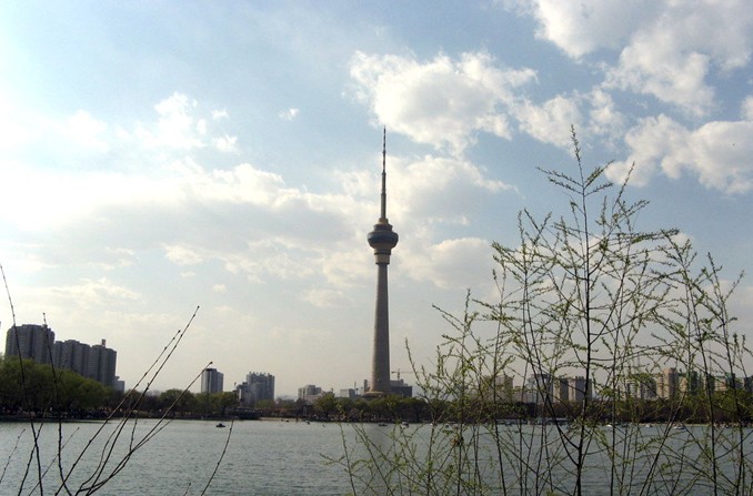 公園西湖水面開闊,波光粼粼,站在中堤西望中央電視發(fā)射塔倒影于湖中,在粼光中搖曳,在碧波中浮游。