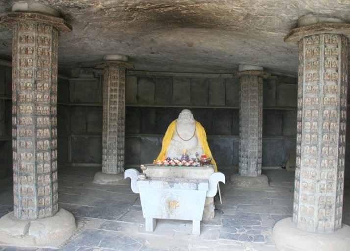 靜琬最初所刻的一百四十六塊石經(jīng)鑲嵌于洞內(nèi)四壁之上。洞中央有四根八角形石柱,每根柱上均有浮雕佛像,共一千多尊,稱千佛柱。由于山洞藏經(jīng)貯滿,遼金時(shí)代續(xù)刻的經(jīng)版就沒再運(yùn)上山,而藏于云居寺南塔下地穴中。