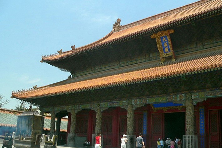從杏壇北望,在雙層石欄的臺基上一座金黃色的大殿突兀凌空,雙重飛檐中海蘭色的豎匾上木刻貼金的群龍緊緊團護著3個金色大字“大成殿”。字徑1米,是清雍正皇帝的手書。