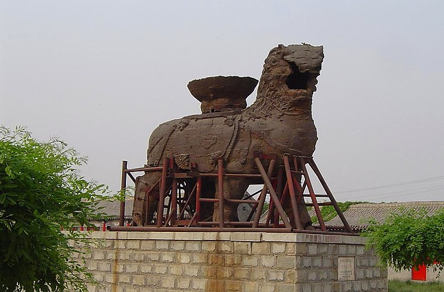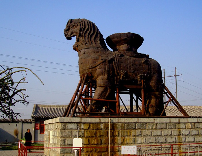 河北滄州鐵獅子鑄于后周廣順三年(公元953年),距今已有一千多年的歷史,采用“泥范明澆法”鑄成,具有較高的歷史科學(xué)和藝術(shù)價(jià)值,為全國(guó)重點(diǎn)文物保護(hù)單位。通寬5.35米,身長(zhǎng)6.30米,身高6.6米,體寬3.0米,重約40噸,素有“獅子王”的美譽(yù),一千多年來(lái),它飽經(jīng)滄桑,在古滄州,它曾被當(dāng)成神物供奉,享盡了香火;在烽火連天、哀鴻遍野的戰(zhàn)亂年代,又經(jīng)受了刀戈的砍殺,在獅體內(nèi)外斑痕累累。